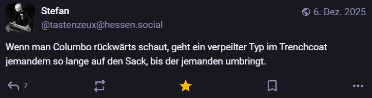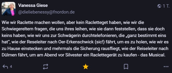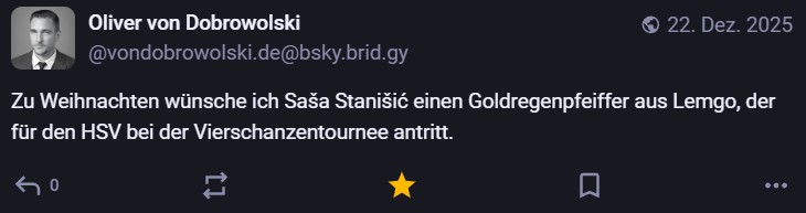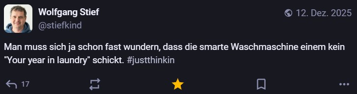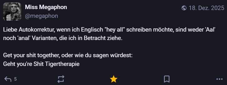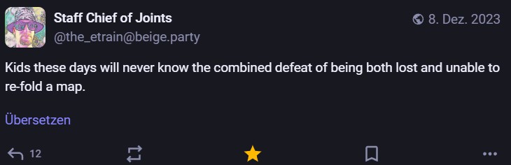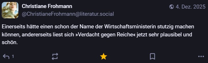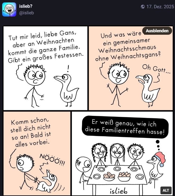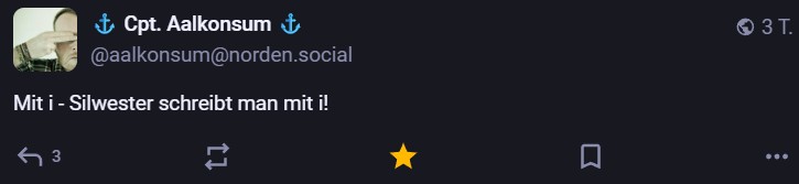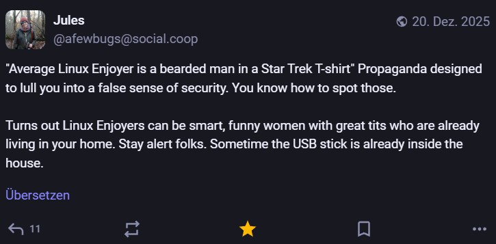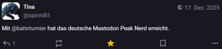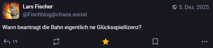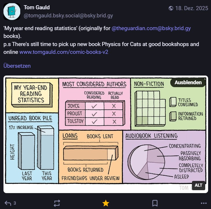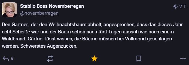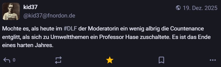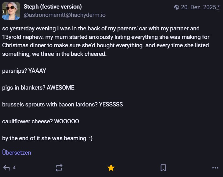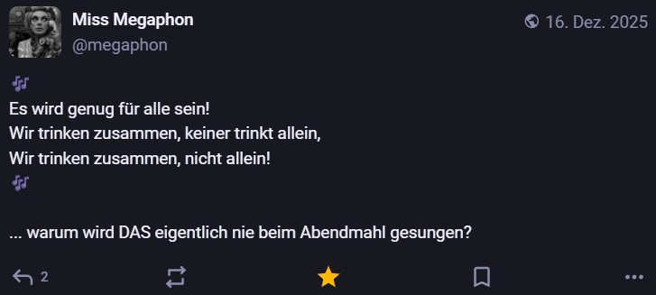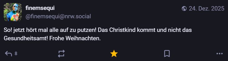 Nachdem ich meinen Jahresrückblick vorhin gepostet habe und bald (morgen vermutlich) noch den Bücherüberblick vom vergangenen Jahr mache, kommt hier noch der letzte Rückblick auf den vergangenen Monat: Die Lieblingströts auf Mastodon vom Dezember. Recht viel feiertagsbezogener Content, aber nicht nur. Und wieder viel, aber das ist ja nichts Neues…