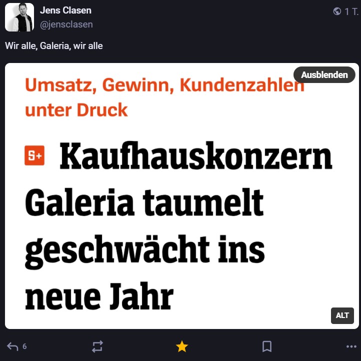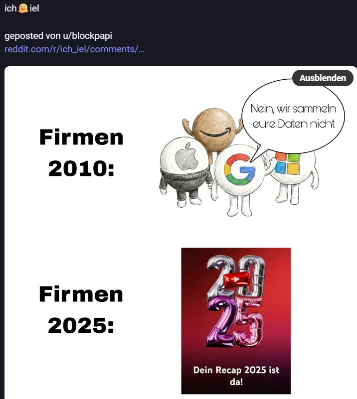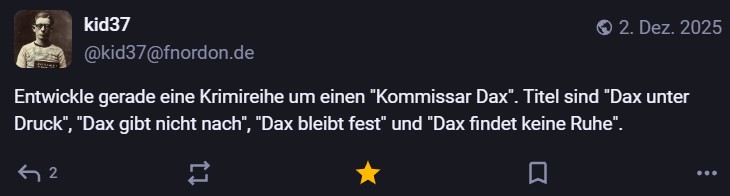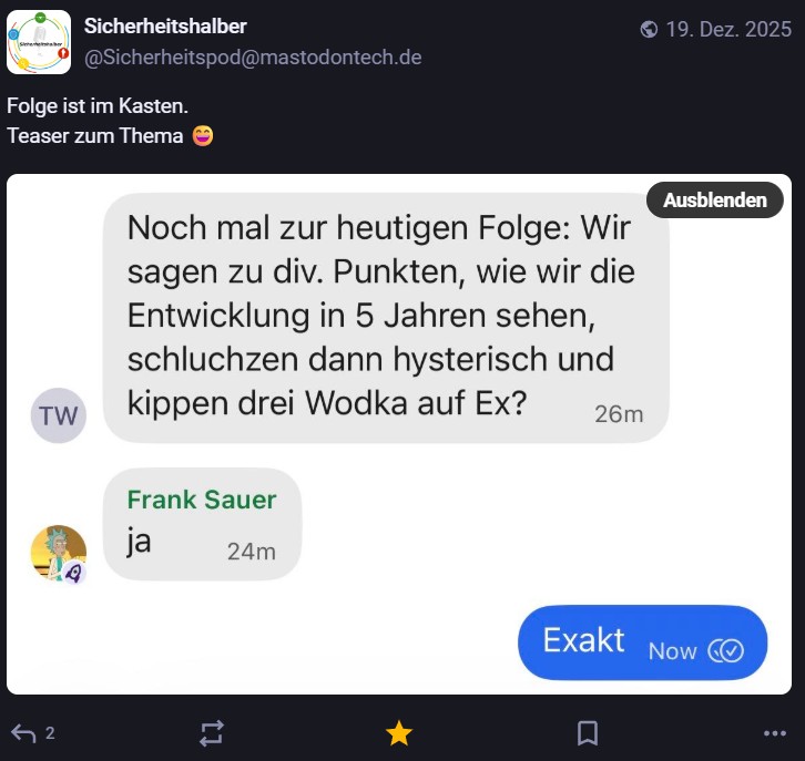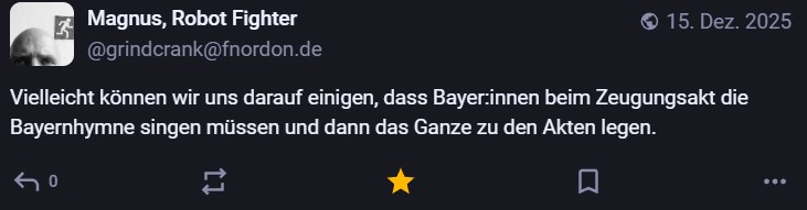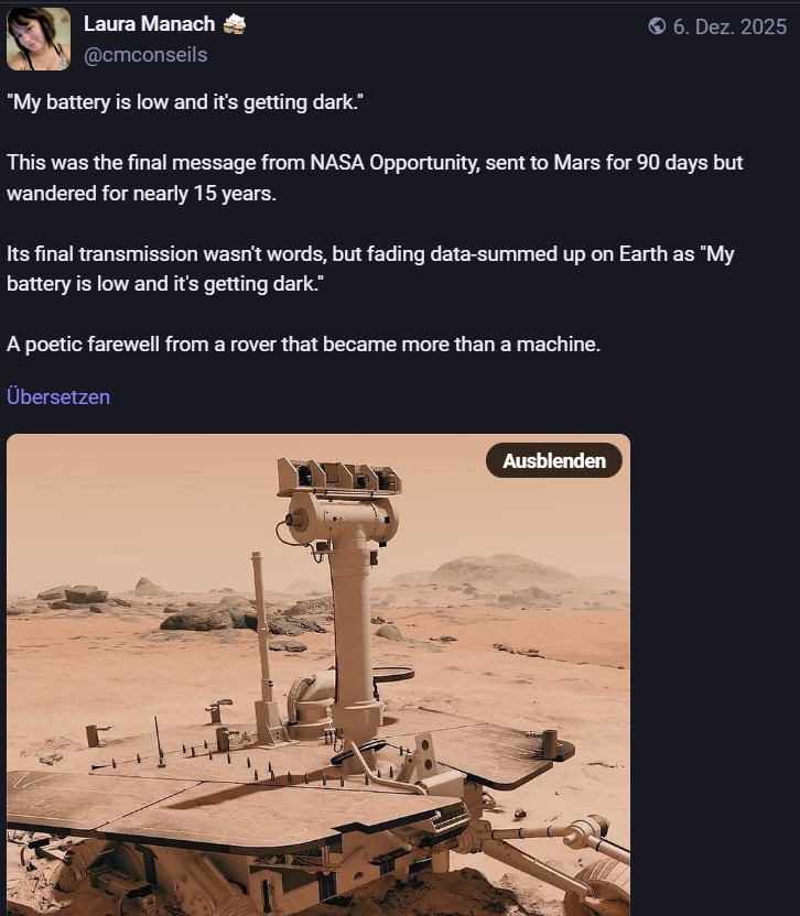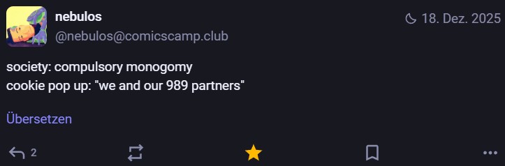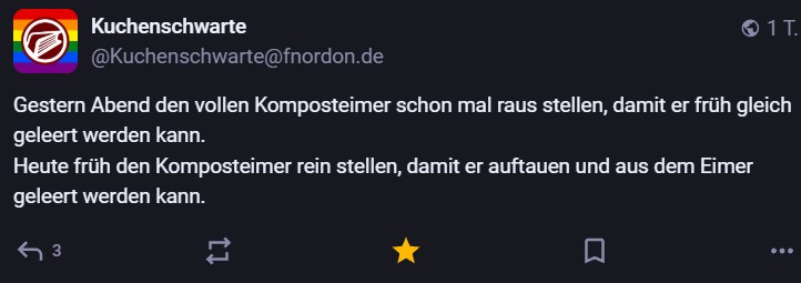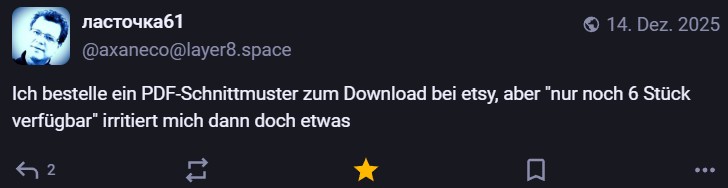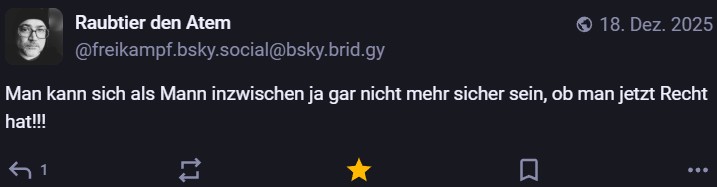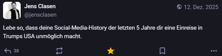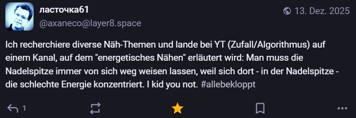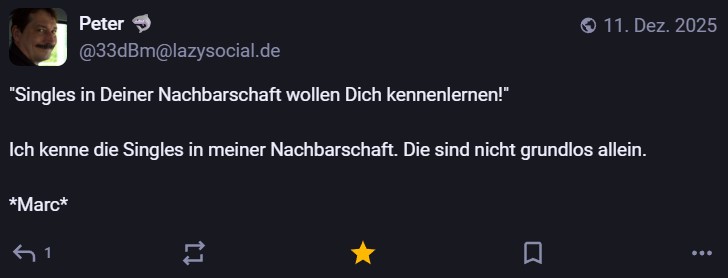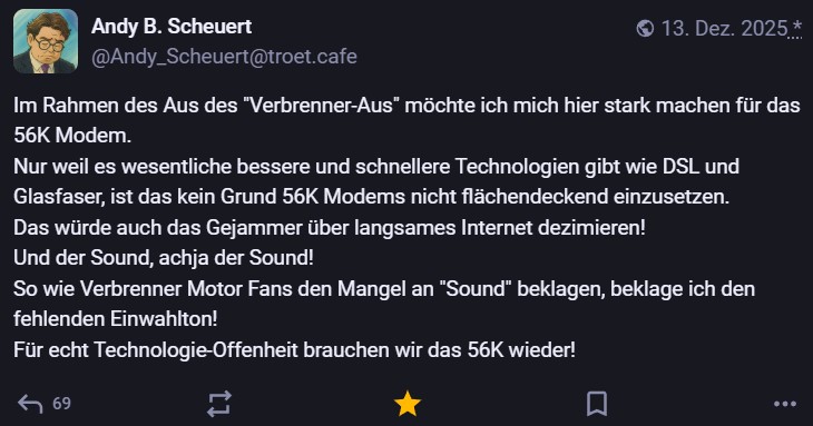 Nachdem ich meinen Jahresrückblick vorhin gepostet habe und bald (morgen vermutlich) noch den Bücherüberblick vom vergangenen Jahr mache, kommt hier noch der letzte Rückblick auf den vergangenen Monat: Die Lieblingströts auf Mastodon vom Dezember. Recht viel feiertagsbezogener Content, aber nicht nur. Und wieder viel, aber das ist ja nichts Neues…