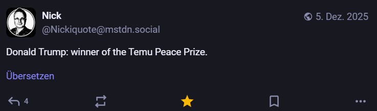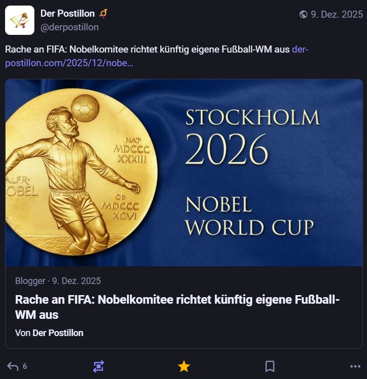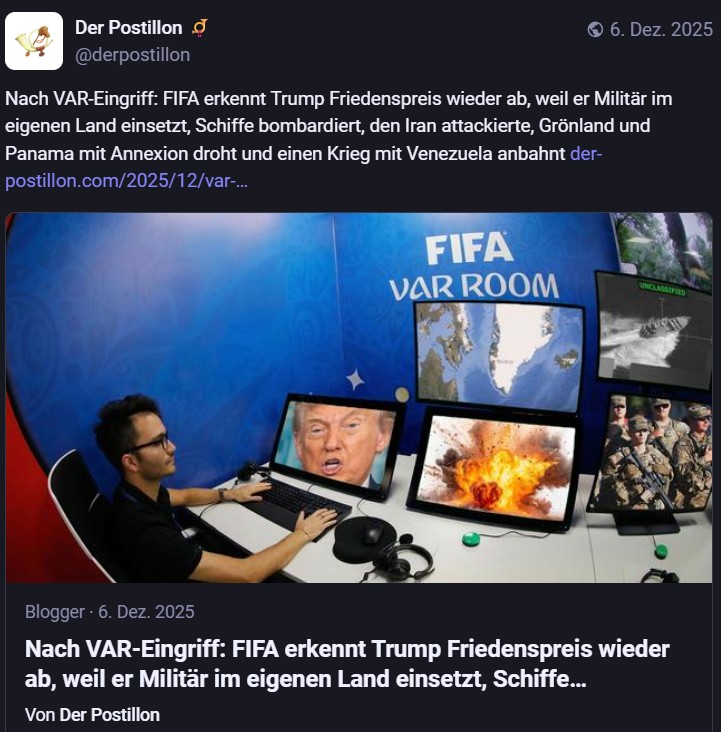 Bei der Auslosung der Gruppen für die Fußball-WM 2026 schaffte die FIFA es mit ihrem „Peace Price“ tatsächlich, sich noch lächerlicher zu machen, als sie sowieso schon sind. Respekt! Einige Tröts dazu: