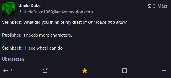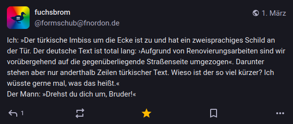 Mal wieder einiges los in der Welt, was das Potenzial hätte, einem die Laune zu verhageln – aber auf Mastodon gab es trotzdem genug Geistreiches und Witziges, was sich lohnt festgehalten zu werden. Hier also meine Auswahl des vergangenen Monats.
