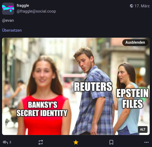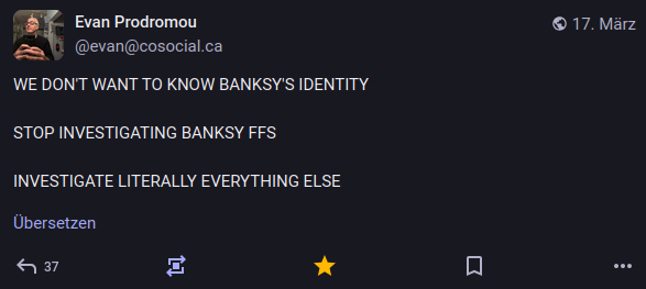 Dann hatten irgendwelche journalistischen Volliditionen nichts Besseres zu tun, als Banksy zu doxxen, weil wir nämlich offensichtlich momentan keine sonstigen berichtenswerten Vorkommnisse auf der Welt haben. Meine Güte.