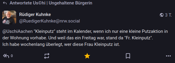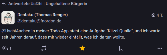 Kontext der nächsten zwei Tröts: Uschi in Aachen hatte einen Eintrag in ihrer Notizen-App, der von der Autokorrektur so verunstaltet wurde, dass sie keine Ahnung mehr hatte, was das eigentlich bedeuten sollte.