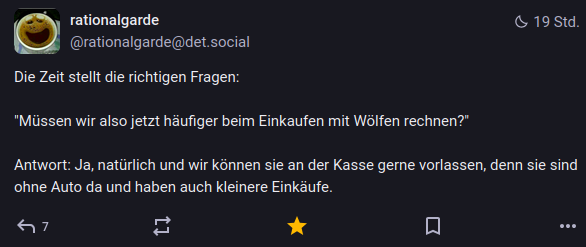Kontext für den letzten Tröt: In Hamburg wurde eine Frau in der Stadt (!) von einem Wolf (!!) gebissen.